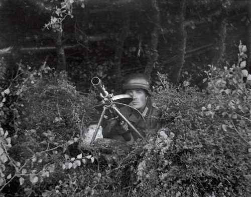 Soldier has a Russian DP-28 7.62mm. machinegun with the 47-round pan-type magazine. This weapon was nicknamed the "record player."