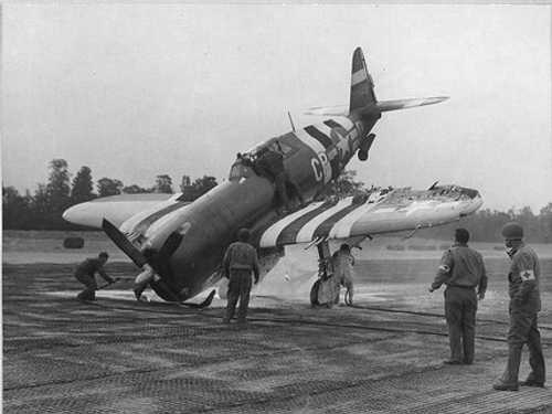 A flak damaged Thunderbolt from the 367th FS, 358th FG, 9th AF after crash landing at an airfield in France. The pilot was wounded by the flak and knocked unconscious when the plane nosed over.(rudeerude)