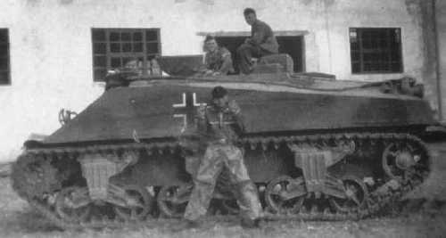 A captured defrocked Sherman tank being used by the German's. Troop transport?