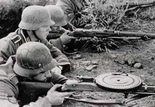 Soldiers armed with a Russian DP-28 (Degtyarev) 7.62mm. MG with a 47-round magazine and two Mosin-Nagant M1891/30 7.62mm. bolt action rifles.