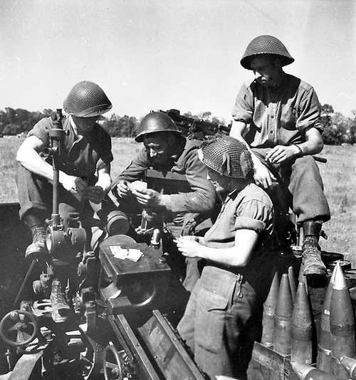 Gunners Len Forbes, Herb Guard, Don Germscheid and Frank Curliss play cards as they await firing orders, France, June 25, 1944