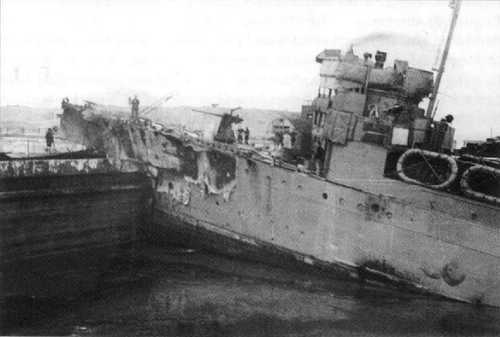 HMS Campbeltown shortly before exploding, sitting high on the southern caisson of the Normandie dock, St. Nazaire. 28th March 1942, Operation Chariot.