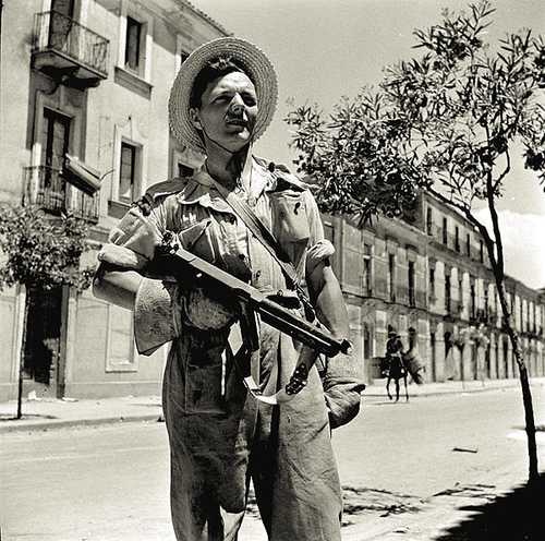 Private Harry McDowell, 48th Highlanders of Canada, has substituted his tin hat for a much more comfortable straw hat. Always time for a smile. Caltagirone, Italy, ca. 2-3 August 1943.