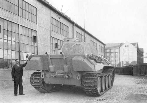 A Panther tank straight from the factory floor with its new Zimmerit coating.