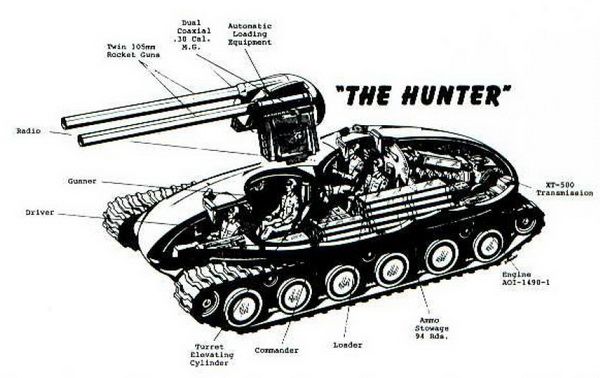 One of the vehicles “envisioned” by the aptly named “Questionmark Conference” was the Hunter, a tank destroyer armed with twin 105mm rocket guns fed by 7 round auto-loaders.