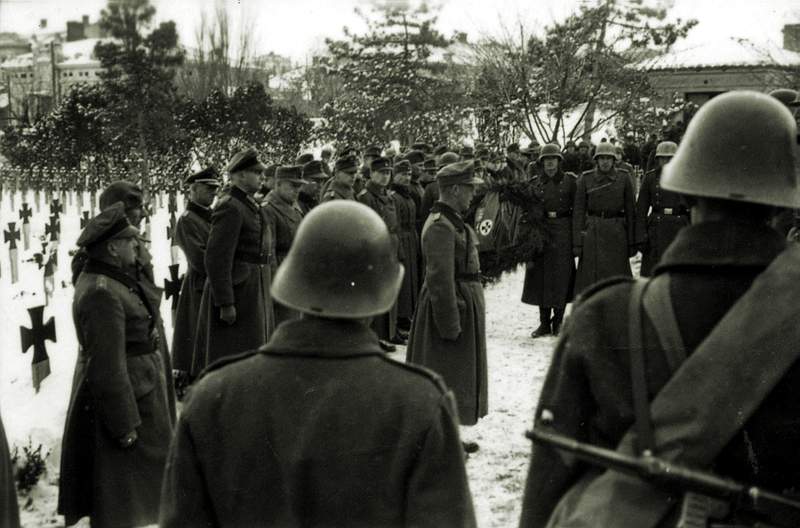 Knight’s Cross holder, Romanian 8th Cavalry Division commander, Brig. General Radu Korne (left), an officer of the Wehrmacht (center) and Sturmbannführer of the Waffen-SS Max Wünsche(right). - September 1943.